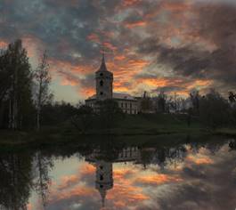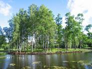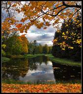Часть прудов лежит в глубоких берегах, заросших соснами, и благодаря этому производит впечатление зеленых ущелий; другие пруды полноводны и извиваются в густой еловой чаще. На одном из последних, обросшем у берегов ирисами, находится овальный Венерин остров с остатками трельяжа, построенного Гонзаго. Окрестности "Белой березы" - лучший образец, но и весь парк был пройден его рукой, и такие дивные пейзажи имеются и на Краснодолинных прудах, и в долине Славянки, и на "Парадном месте". Конечно, много деревьев засохло, иногда на полянах посажены ненужные лиственницы и кедры, а иногда вырублены великолепные разлегшиеся по земле ветлы, но картины, созданные гениальным мастером, еще целы и заслуживают самого внимательного отношения и изучения. Только что упомянутые Краснодолинные пруды начинаются у "Круглого зала", который был построен в конце царствования императора Павла в центре так называемой "Звезды", т.е. обширного краевого участка парка, лежащего на левом берегу Славянки.