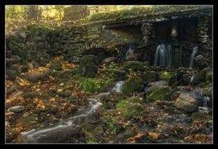 Следующий участок на берегу реки невелик и состоит из амфитеатра, т.е. полулунных террас, спускающихся к зеленой площадке на левом берегу. На этой площадке когда-то били фонтаны, а наверху полукругом посажены высокие ели. Напротив, на холме находится монументальная скамья, и все вместе представляет своеобразную северную переделку итальянских садовых театров. К сожалению, не сохранилось чаши фонтана и ни одного изображения, целы только трубы и далеко в чаще резервуар - Фонтанный пруд. Эта часть парка заканчивается мостом у Пиль-башни - одного из излюбленных мотивов пейзажных парков, состоящего из полуразрушенной башни-мельницы. На самом деле мельницы никогда не существовало, а была холодная мыльня с каскадом, устроенным так, что под него можно было садиться. Художники иначе дополняли картину, добиваясь иллюзии пейзажа Буше или Робера. Трудно судить о том, насколько это соответствовало действительности, но приходится сомневаться в достаточности иллюзии, так как на противоположном берегу находится Хмелевая беседка из стриженой зелени, скорее напоминающая трельяжи леблоновских садов, чем развалины Ю. Робера.