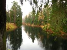 Берега Славянки ниже Пиль-башни - один из лучших образцов пейзажного парка. Полноводная речка извивается по неширокой долине, наверху склоны поросли