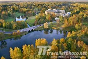 2) центральной композицией является дворец, стоящий на высоком берегу над искусственными озёрами