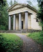 Дальше следует один из лучших участков не только этого, но и других парков пейзажного стиля. Река красиво извивается по долине, и в одной из излучин ее стоит Храм Дружбы. Шестнадцать дорических колонн этой постройки вырастают из низкого цоколя и поддерживают очень плоский зеленый купол над дорическим антаблементом. Колонны каннелированы и выкрашены в белый цвет, как и медальоны на круглом теле здания, которое само покрашено охрой, а крыша его - зеленая.