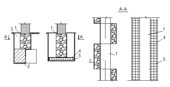 4. У випадках значних нерівномірних деформацій основи, зміни величини навантажень і статичної схеми роботи фундаментів, необхідності підвищення жорсткості будівлі здійснюють перебудову стовпчастих фундаментів у стрічкові мал.4.4.