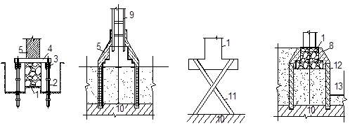 а - задавлюваними; б - набивними; в – буроин’єкційими; г - стіною в ґрунті; 1 - існуючий фундамент; 2 - металеві трубчасті палі; 3 - оголовок ; 4 - монолітна залізобетонна балка; 5 - стіна будівлі; 6 - труба для подачі бетону; 7 - набивна паля; 8 - залізобетонна обойма; 9 - колона; 10 - щільний ґрунт; 11 - буроін’єкційна паля; 12 - стіна в ґрунті; 13 - підвальне приміщення.