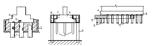 Рис.4.3 Схеми підсилення фундаментів палями та глибокими стінами: