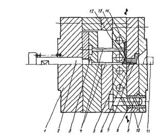 1 — подвижная полуформа; 2 — толкатель; 3 — выталкивающая плита, 4 — выталкиватели; 5 — каналы системы термостатирования формы; 6 — литниковая втулка; 7 — центральный литник; 8 — центрирующая втулка; 9 — центрирующая колонка; 10 — неподвижная полуформа; 11 — сопло литьевой машины; 12 — разводящий литник; 13 — впускной литник; 14 — формообразующая полость