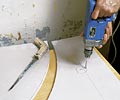 Отпилите вычерченный профиль узкой ножовкой по дереву и наметьте отверстия под светильники. Высверлите нужный диаметр электродрелью.