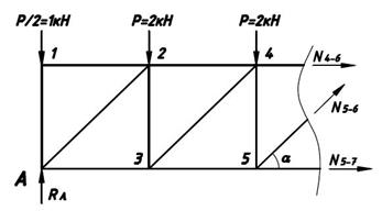 Усилие N4-6 определим способом моментной точки. Проводим сечение и рассматриваем равновесие левой части, за моментную точку принимаем точку 5.