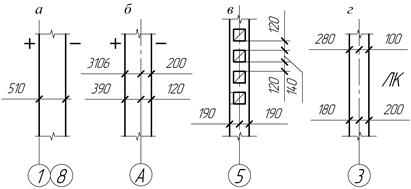 Характер привязки стен к координационным осям показать на эскизах, например, так, как на рисунке, где а – односторонняя (нулевая) привязка наружной стены; б – двусторонняя привязка наружной стены; в – центральная привязка внутренней стены; г – двусторонняя привязка стен лестничной клетки.