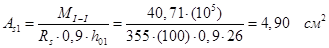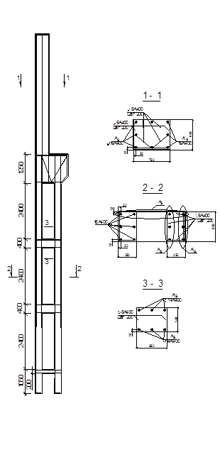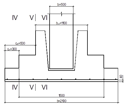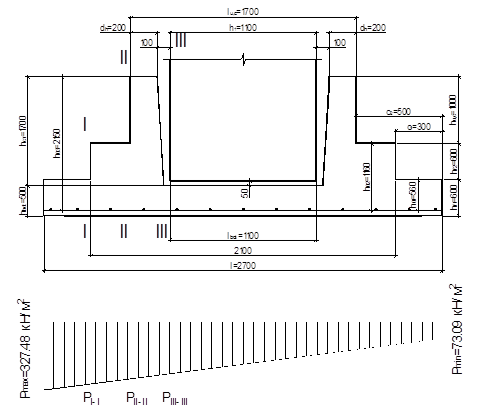 Подбор арматуры производим в 3–х сечениях фундамента, которые в расчетной схеме (консольные балки под действием отпора грунта) отражают изменение пролетов и высот сечения консолей (см. рис. 10).