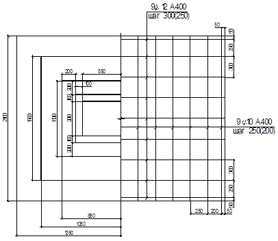 Поскольку длина подошвы не превышает 3 м, все стержни в продольном направлении доводим до конца, в противном случае каждый 2–ой стержень в продольном направлении не доводим до конца на 0,1l (с округлением в меньшую сторону кратно 5 см).