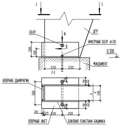 Башмак крепим к фундаменту двумя анкерными болтами, работающими на срез и растяжение. Сжимающие усилия передаются непосредственно на фундамент.