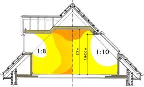 1.3*... Естественное освещение следует принимать согласно требованиям СНиП 23-05-95. При этом отношение площади световых проемов всех жилых комнат и кухонь квартир и общежитий к площади пола этих помещений, как правило, не должно превышать 1:5,5. Минимальное отношение должно быть не менее 1:8, для мансардных этажей, при применении мансардных окон допускается принимать отношение 1:10. Данный пункт указывает, что при применении мансардных окон расположенных в скате кровли допускается на 25% меньшая площадь остекления по сравнению с применением вертикальных окон в типовом этаже. К сожалению, при применении люкарен/слуховых окон в мансарде проектировщики при расчете площади остекления применяют коэффициент 1:8, что приводит к недостаточной освещенности помещений. Этот коэффициент предусмотрен для расчета светопрозрачных конструкций в традиционном этаже с вертикальными стенами. При использовании в мансарде вертикальных окон образуются глубокие откосы, в которых задерживается до 2/3 естественного света по сравнению с мансардным окном (см. рис. 3).