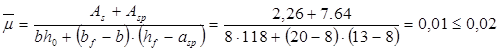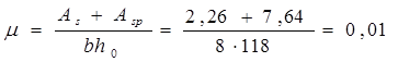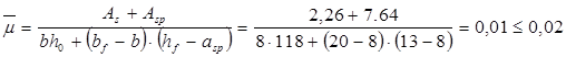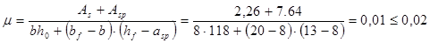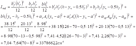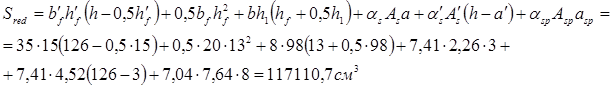 Ired =3378662,2 (см4 ); Wred =48266,6 (см3 ); Wpl =72400 (см3 ); As =2,26 (см2 ); Asp = 7,64 (см2 ); A’s = 4,52(см2 );