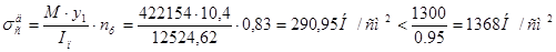 Напряжение смятия в торцах ригеля при a = 14о :