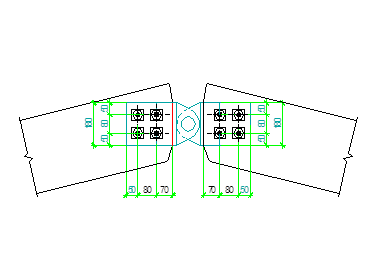 Торцы клееных блоков ригеля в узле соединяем впритык не по всей высоте, а со срезом крайних досок под углом по 25 мм для большей шарнирности узла и предотвращения откола крайних волокон при повороте элементов шарнирного узла. Боковая жесткость узла обеспечивается постановкой парных накладок сечением 200x125 мм на болтах d=20 мм.