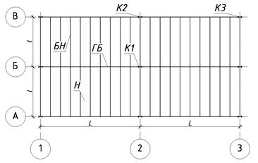 Балочная клетка состоит из следующих элементов: стального настила (Н), укладываемого по балкам настила (БН), главных балок (ГБ), располагаемых обычно параллельно большей стороне перекрытия. Таким образом, балки настила воспринимают полезную нагрузку от массы настила и пола и передают всю нагрузку на главные балки, а главные балки – на колонны.