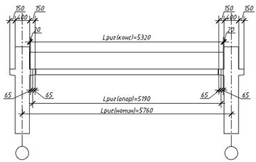 По центру площадок опирания ригеля на колонны действуют опорные реакции. Расстояние между этими реакциями – это расчетная длина ригеля. Длина площадки опирания плиты на ригель равна 130мм. Следовательно, опорные реакции будут находиться в 65мм (130мм/2) от краев ригеля с обеих сторон. Расчетная длина ригеля будет определяться по формуле: