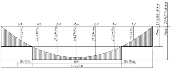 Для построения эпюры материалов необходимо в первую очередь построить эпюру моментов, возникающих ригеле и нанести на нее максимальное и промежуточные значения моментов. Промежуточные значения величин моментов определяем по формулам: