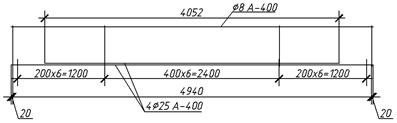 Длину верхнего стержня рабочей арматуры определяем по эпюре материалов. Требуемая длина стержня будет равна: 3052 + 500 ∙ 2 =4052 . Учитывая, что шаг внутренних стержней 400мм, а шаг стержней в приопорных зонах 200мм, принимаем длину верхнего стержня рабочей арматуры 4052мм, оставляя с обоих концов выпуски по 26мм для сварки: