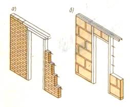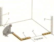Зведенню перегородок (Рис. 4.1.) передує розмітка подовжньої осі, місць примикання до капітальних стін будівлі і місцеположення отвору. Потім шаром розчину вирівнюють основу і встановлюють шаблони і порядівки.