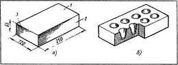 5. Керамічну цеглу випускають розміром: 250x120x65 мм; рідше: 288x138x65 мм (модульна) і 250x120x88 мм (потовщена). Оскільки вага 1 цеглини не повинна перевищувати 4 кг, потовщену і модульну цеглу роблять з пустотами. Прийняті наступні назви граней цегли: великої - постіль (1); бокової довгої - ложкова (2); торцевої - тичок (поперечник) (3) -(див. рис. 2.1.).