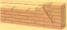 До порядівок закріплюють шнур - причалку, для зведення зовнішніх верст шнур – причалку встановлюють для кожного ряду, натягуючи його на рівні верха укладеного ряду відступом від вертикальної площини мурування на 3-4 мм. Шнур – причалку закріплюють за допомогою причальної скоби, гострий кінець якої вставляють у шви мурування, а до тупого довшого кінця, який спирається на маячну цеглину. (Рис. 4.2.).