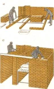 Перш ніж почати кладку, готують основу і розмічають на ній контури перегородки. Цеглину заздалегідь замочують, оскільки сухий матеріал відбирає воду з розчину, а це приводить до зниження міцності конструкції. Спочатку укладають на розчин крайню цеглу. Між ними натягують шнур, по якому потім виводять весь ряд. Рухаються, як правило, зліва направо. Цеглину кладуть так, щоб надійно перекрити сполучні стики нижчележачого шару. Після завершення декількох рядів перевіряють схилом вертикальну лицьової поверхні стіни, а рівнем - горизонтальне положення верхнього ряду. Шви між окремою цеглою повинні бути заповнені розчином. Виключення - кладка «пустошовка», вживана в тих випадках, коли стіну передбачається штукатурити, для чого між цеглинами залишають вільний простір на глибину 10-15 мм. Якщо розчин доходить до лицьової поверхні, така кладка називається «впідрізку». Для ущільнення розчину і надання стіні чіткого малюнка шви в цьому випадку розшивають. Надлишок розчину видавлюють цеглиною або підрізають кельмою, або загладжують розшивкою, робоча частина якої може мати різну конфігурацію.