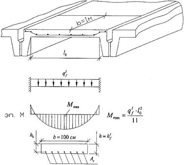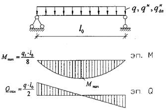 Поскольку возможен свободный поворот опорных сечений, расчётная схема панели представляет собой статически определимую однопролётную балку, загруженную равномерно распределённой нагрузкой, в состав которой входят постоянная, включая вес пола и собственный вес панели, и временная.