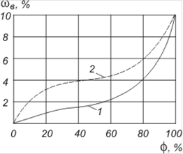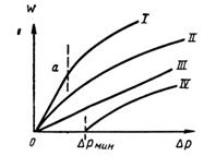 Прямолинейный участок от 0 до точки а на кривой 1 свидетельствует о ламинарном движении воздуха по порам материала с равномерной пористостью при малых значениях разности давлений. Выше этой точки на криволинейном участке происходит турбулентное движение. В материалах с разными размерами пор движение воздуха турбулентно даже при малой разности давлений, что видно из кривизны линии 2. В маловоздухороницаемых материалах, напротив, движение воздуха по порам ламинарно и при довольно больших разностях давлений, поэтому зависимость G от ΔР линейна при любой разности давлений (линия 3). Во влажных материалах (кривая 4) при малых ΔР , меньших определенной минимальной разности давлений ΔРмин , воздухопроницаемость отсутствует, и лишь при превышении этой величины, когда разность давлений окажется достаточной для преодоления сил поверхностного натяжения воды, содержащейся в порах материала, возникает движение воздуха. Чем выше влажность материала, тем больше величина ΔРмин .