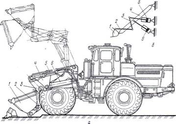 Одноковшовый универсальный строительный погрузчик монтируют на базе гусеничных тракторов и колесных тягачей. Он предназначен для механизации погрузочных и строительно-монтажных работ при помощи сменного рабочего оборудования. Главным типом рабочего оборудования является ковш: кроме него погрузчики имеют и другие виды навесного оборудования. На рис. 7.2 показаны основные виды рабочего оборудования