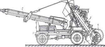 Общий вид многоковшового погрузчика показан на рис. 7.6, а. Рабочим органом является шнековый питатель, который состоит из двух шпеков с правым и левым направлением спирали. Шнеки расположены по обеим сторонам ковшового элеватора. При вращении питателя погружаемый материал подается к ковшам, что способствует лучшему загребанию материала ковшами. Внизу под шнековым питателем прикреплен скребок. Обычно материалы с элеватора разгружаются на ленточные конвейеры, которые подают его в транспортные средства.