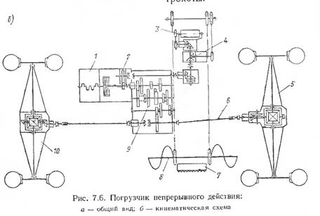 На,рис. 7.6, б показана кинематическая схема погрузчика. Двигатель / через зубчатые колеса 2 приводит в движение конические передачи 4. Одна из них сообщает движение через цепную передачу ковшовому элеватору 7 и шнековому питателю 8, а другая коническая пара через цепную передачу приводит во вращение барабан 3 ленточного конвейера. Двигатель / через коробку передач 9 и карданные валы 6 передает вращение заднему и переднему мостам 5 и 10.