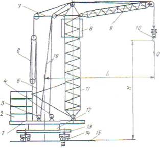 1 - поворотная платформа; 2 - противовес; 3.4 — стреловая и грузовая лебедки; 5, 6 — стреловые канат и полиспаст; 7 — консоль; 8 — кабина управления; 9 — стрела; 10 - крюковая подвеска; 11 — башня; 12 — опорно-поворотное устройство и механизм поворота; 13 - рама ходового устройства; 14 - ходовые тележки; 15 — крановые пути; 16 - грузовой канат