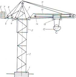 ' — фундамент; 2 — башня; 3 -кабина управления; 4 — механизм поворота; 5 — консоль; 6 — противовес; 7,8 — грузовая и стреловая лебедки; 9 — наголовник; 10 — стрела; 11 — грузовой канат; 12 — крюковая подвеска; 13 — грузовая тележка; 14 — лебедка перемещения грузовой тележки