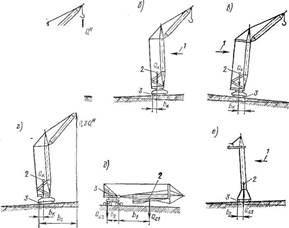 Расчет устойчивости производится для следующих случаев: при работе крана с,грузом (грузовая устойчивость, рис. 5, а), нерабочего состояния (собственная устойчивость, рис. 5, б, в), внезапного снятия нагрузки с крюка (обрыв груза, рис. 5, г), монтажа (демонтажа) крана.