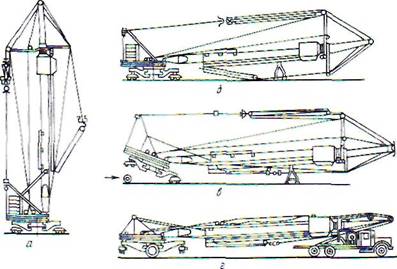 а, б — опускание стрелы и башни; в - установка пневмоколесной оси; г -транспортное положение
