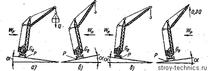 Устойчивость крана определяют для наиболее неблагоприятных условий его работы. Так, при расчете грузовой устойчивости крана предполагают, что кран поднимает груз Q, равный грузоподъемности крана на данном вылете, при этом груз имеет максимально возможную площадь; ветровые нагрузки рабочего состояния Wp действуют со стороны противовеса, кран стоит на уклоне а (в сторону груза). При проверке собственной устойчивости крана считают, что на кран действуют ветровые нагрузки нерабочего состояния в сторону противовеса W„, кран стоит на уклоне а (в сторону опрокидывания) без груза. Если кран в нерабочем состоянии имеет возможность свободного вращения под действием ветровых нагрузок, при проверке собственной устойчивости считают, что ветер направлен со стороны противовеса. Для проверки устойчивости при внезапном снятии нагрузки считают, что кран располагается на уклоне в сторону опрокидывания, нагрузка на крюке принимается направленной вверх, а ветровая нагрузка рабочего состояния Wp направлена со стороны стрелы.