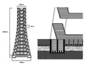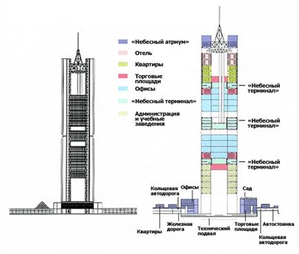 Висота башти складає 1 кілометр, діаметр у основи – 400 м, наверху – 160 м. Всі поверхи споруди згруповані в 14 блоків по 14 поверхів. Кожний блок являє собою ввігнуту чашу, на дні якої розташована рекреаційна зона з живими деревами і ставками (мал. 1.1.2).