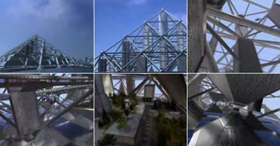 Окремо потрібно сказати про конструктивне рішення Mega-City Pyramid. Конструкція міста нагадує кристалічну гратку (мал. 1.3.2), всередині якої знаходяться гігантські хмарочоси. Вони і сформують величну тривимірну основу, усередині якої навіть зможуть літати вертольоти. Як базові будівельні елементи цього пірамідального каркаса японські інженери запропонували використовувати гігантські труби, виконані на основі надміцного і легкого матеріалу, складеного, у свою чергу, з вуглецевих нанотрубок. Така система повинна амортизувати поштовхи при землетрусі. Також весь каркас розрахований на стійкість до цунамі і ураганів. І хоча окремі стіни будівель можуть бути пошкоджені під час стихійних лих – вся піраміда в цілому збереже стійкість. Нановуглецеві троси каркасу, за думкою японських інженерів, може плести гігантський робот-павук. Для нашого часу ця ідея не видається реальною, але проект розрахований не на найближчий час. Втім, італійський архітектор Данте Біні і його компанія BiniSystems пропонують для висячого міста власну концепцію зведення каркаса, якою передбачається створення тимчасових надувних сфер як зручної опори для вмонтованих гігантських труб. Величезні труби, що з'єднуються в кулястих вузлах, повинні стати вулицями міста. Усередині похилих труб ліфти і ескалатори, а в горизонтальних - бігучі доріжки. Вузли послужать не тільки з'єднанню конструкції в міцну систему, але стануть також пересадочними станціями. Також тут задумана система автоматичних безпілотних капсул-таксі, що пересуваються усередині тих же труб.