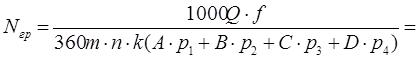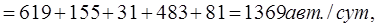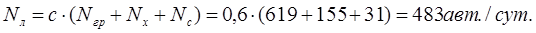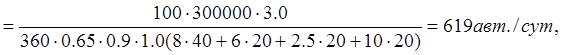 где Q – грузооборот между пунктами отправления грузов, т. е. годовой объем грузов, перевезенных в обоих направлениях, Q=300000 т.; f – коэффициент сезонности, учитывающий неравномерность перевозок по отдельным месяцам, f=3,0; m – коэффициент использования пробега, m=0,65; n – коэффициент использования грузоподъемности, n=0,9; k – коэффициент использования автомобилей, k=1,0; A, B, C, D,– грузоподъемность автомобилей, т, соответственно 8, 6, 2.5, 10; p1 , p2 , p3 , p4 , – число автомобилей, %, соответственно 40, 20 , 20, 20.