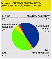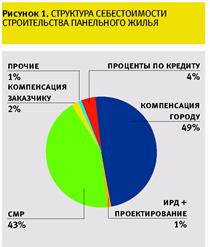 Ориентировочная структура полной себестоимости жилья для застройщика в стоимостном и процентном выражении представлена в таблице и на рис. 1 и 2. Таким образом, полная себестоимость 1 кв. м полезной площади готового дома для застройщика составляет по панельному дому 1245 долларов, по монолитному -1357 долларов, а по кирпичному – 1624 доллара.