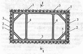 До начала земляных работ по всему периметру котлована устраивают шпунтовое ограждение (рис. 1). Цель шпунтового ограждения – воспрепятствовать сползанию и обрушению грунтовых массивов, находящихся за пределами строительной площадки. В качестве несущих элементов шпунтового ограждения используют металлические трубы или сортаментные прокатные балки – швеллеры или двутавры. Расчетом устанавливают расстояние металлическими элементами и их характеристики: для труб – это длина, диаметр, толщина стенки; для балок – длина и номер их сортамента.