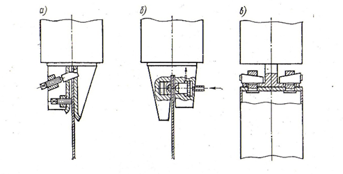 а – клиновый наголовник для шпунта; б – гидравлический наголовник для шпунта, стальных труб и оболочек; в-клиновый наголовник виброгрейфера продольно-вращательного действия (на схеме клиновые пары условно показаны развернутыми на 900 )
