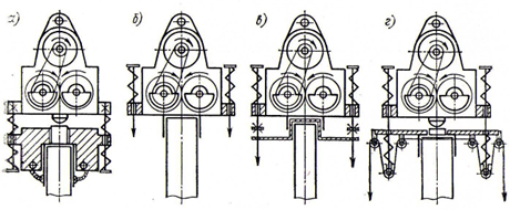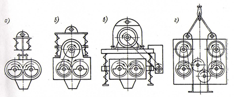 а – бестрансмиссионный вибропогружатель с отдельным амортизатором и жестким грузозахватным органом; б – трансмиссионный вибропогружатель со встроенным приводным электродвигателем и амортизатором с жестким грузозахватным органом; в-вибропогружатель с подрессоренной пригрузкой, приводным электродвигателем обычного исполнения и жестким грузозахватным органом; г – вибропогружатель со встроенными приводными электродвигателями, центральным проходным отверстием и гибким грузозахватным органом