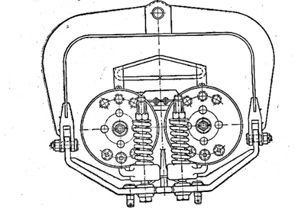Вибромолоты по этой схеме впервые были предложены и осуществлены С.Я. Цаплиным, причем им же были разработаны и испытаны конструкции вибромолотов специально для погружения металлического шпунта. На рис. 7 приводится общий вид модели вибромолота конструкции С.Я. Цаплина, имеющего следующую техническую характеристику: