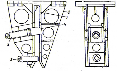 Наиболее выгодным, с точки зрения удовлетворения поставленным выше трем условиям, оказался клиновый наголовник, предложенный В.Н. Тупиковым и автором. К плите наголовника с помощью болтов, проходящих через нижнюю плиту вибратора, крепятся две массивные щеки 1 , между которыми заводится погружаемый шпунт. Щеки наголовника и шпунт имеют отверстия, в которые заходит клин 2 . Заводка последнего осуществляется винтом 3 , вращающимся в массивной гайке 4 , укрепленной к ребрам одной из щек наголовника.