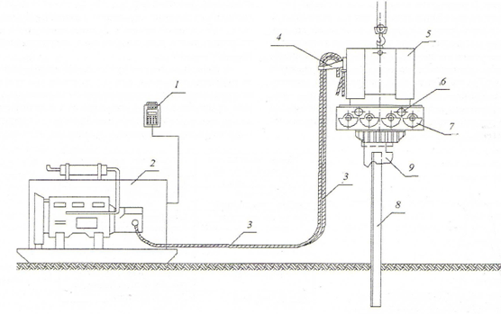 1 – дистанционное управление; 2 – дизельный агрегат; 3 – гидравлические масляные шланги; 4 – эластичная подвесная опора шлангов; 5 – амортизатор; 6 – гидравлический двигатель; 7 – дебаланс; 8 – погружаемый элемент; 9 – гидравлические зажимы