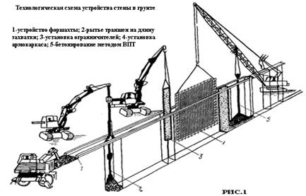 Монолитные железобетонные стены при их возведении разбивают на захватки длиной 4...6 м, которые отделяют друг от друга железобетонными сваями или инвентарной перегородкой. Затем грунт извлекают из этой захватки траншеи под слоем глинистого раствора, устанавливают арматурные каркасы и укладывают бетонную смесь методом ВПТ по аналогии с сооружением буронабивных свай. При бетонировании соблюдают очередность: сначала бетонируют четные, а затем нечетные захватки траншей, которые стыкуют между собой.