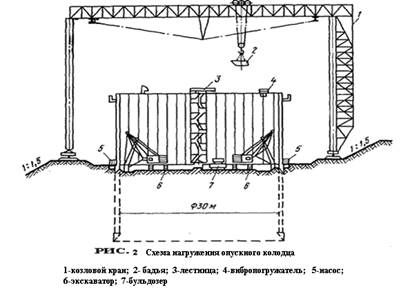 На строительстве опускным способом (рис. 2) сооружений диаметром более 20 м используют одноковшовые экскаваторы, которыми внутри опускного колодца разрабатывают грунт и грузят его в бадьи вместимостью 1,5...2 м3 . Бадьи поднимают на поверхность башенными или козловыми кранами и разгружают в отвал или в автотранспорт. Учитывая значительную массу экскаватора, его опускают в котлован в разобранном виде.
