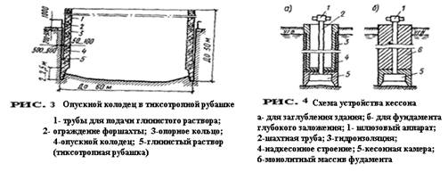 Способ кессона применяют в сильнообводненных, крупнообломочных или скальных грунтах, когда нежелательны осадки расположенных вблизи сооружений или имеется опасность наплыва грунта в колодец. Последовательность производства кессонных работ заключается в том, что сначала сооружают кессонную камеру (рис. 4), на потолке которой монтируют шахтную трубу и шлюзовый аппарат. От компрессорной станции в камеру нагнетают сжатый воздух, вытесняющий из нее воду. Грунт в кессоне разрабатывают гидромеханическим способом или вручную. По мере погружения на потолочной части камеры возводят надкессонное строение.